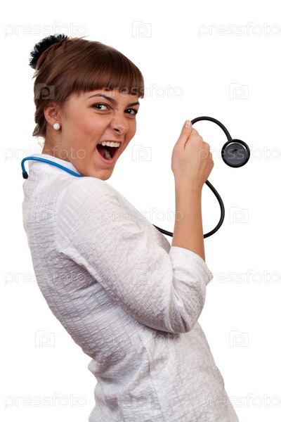 Молодая женщина-врач со стетоскопом поет на белом фоне