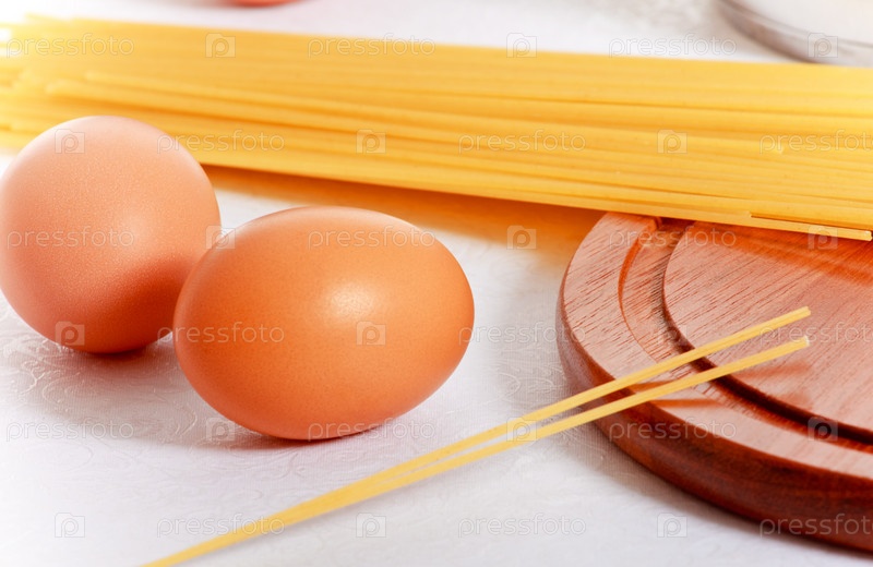 Куриные яйца и спагетти на кухонном столе