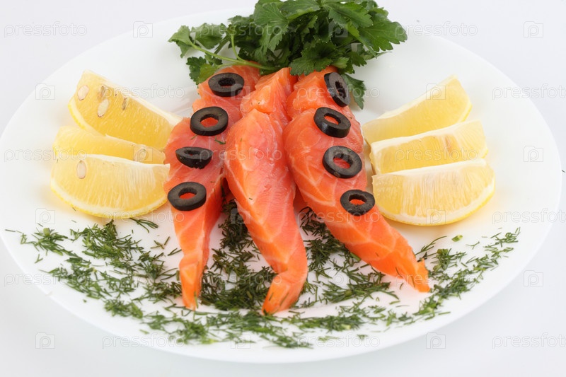 Красная рыба с оливковыми кольцами, зеленью и дольками лимона на тарелке