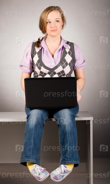Красивая девушка работает на ноутбуке