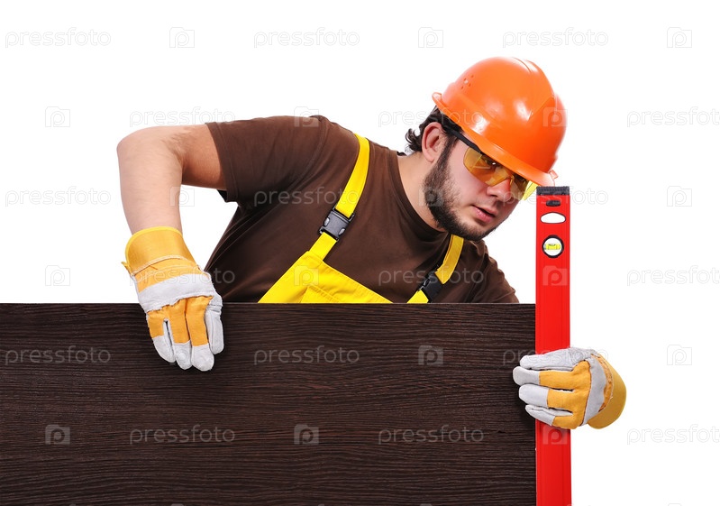 Строитель измеряет поверхность на белом фоне