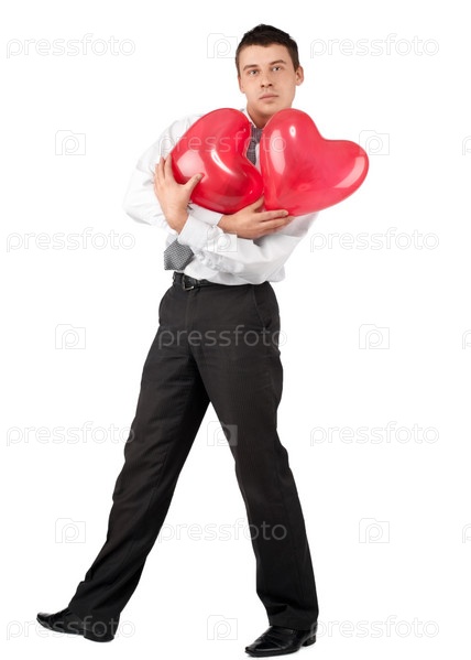 Красивый молодой человек с двумя красными воздушными шарами в виде сердца