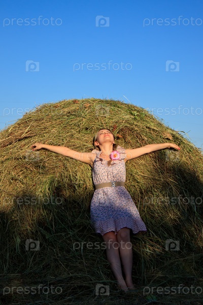 Девушка лежит на стоге сена