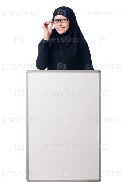 Мусульманская женщина с чистой доской на белом фоне