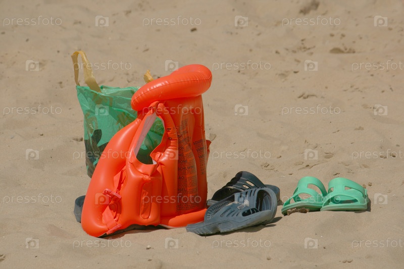 Шлепки и надувной жилет на пляже