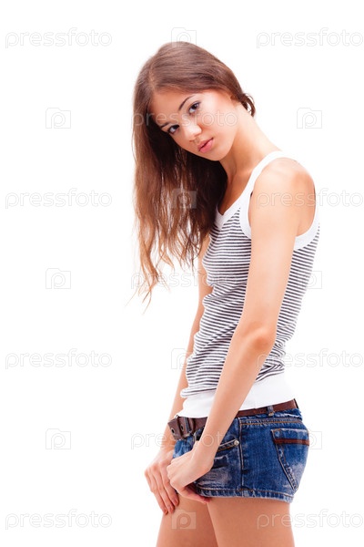 Девушка стоит на белом фоне