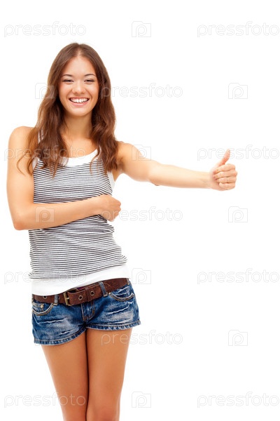 Женщина показывает большой палец на белом фоне