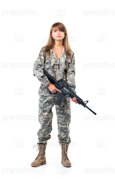 Молодая женщина-солдат в камуфляже с оружием