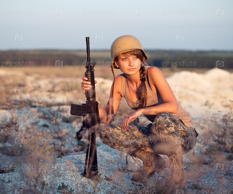Молодая женщина-солдат в камуфляже с оружием