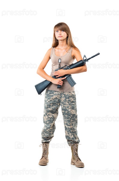 Молодая женщина-солдат в камуфляже с оружием