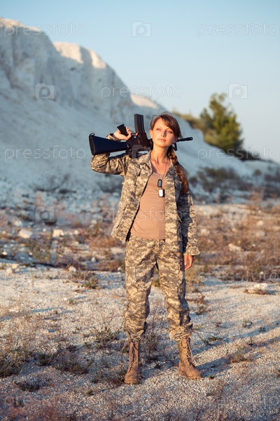 Молодая женщина-солдат в камуфляже с оружием