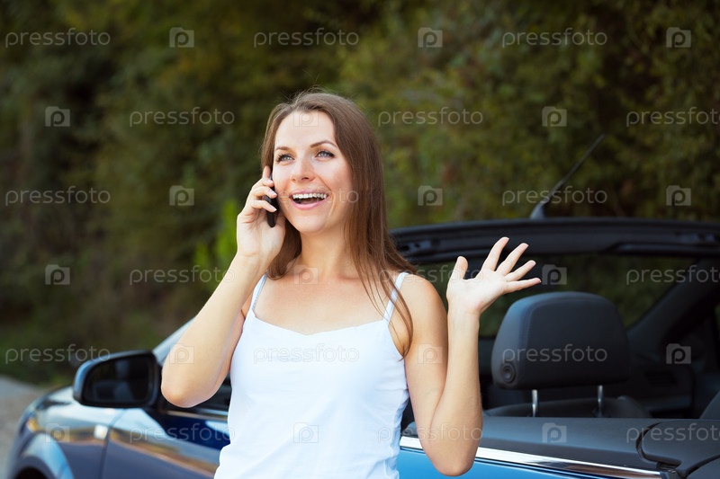 Улыбающаяся женщина разговаривает по телефону возле кабриолета