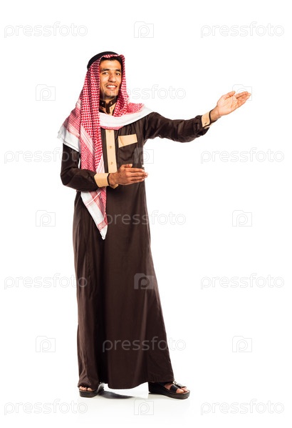Молодой улыбающийся араб приглашает жестом, изолированный на белом
