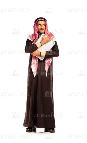 Молодой улыбающийся араб с алюминиевым кейсом, изолированный на белом