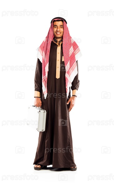 Молодой улыбающийся араб с алюминиевым кейсом, изолированный на белом