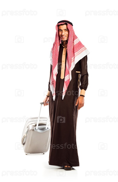 Молодой улыбающийся араб с алюминиевым кейсом, изолированный на белом