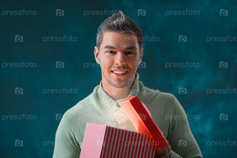 Радостный мужчина открывает большой подарок