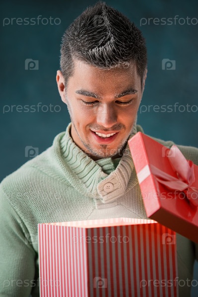 Радостный мужчина открывает большой подарок