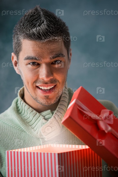 Радостный мужчина открывает большой подарок