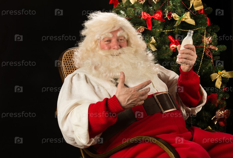 Счастливый Санта-Клаус пьет молоко из стеклянной бутылки на фоне елки