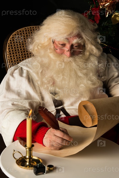 Санта-Клау пишет пером письмо на старой бумаге, сидя дома