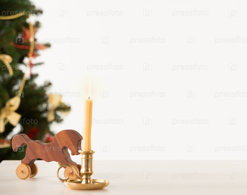 Старинные деревянные лошадь и корабль на столе на фоне елки