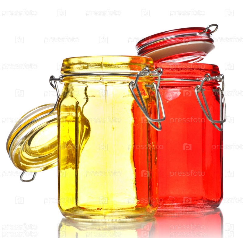 Пустые стеклянные банки на белом фоне