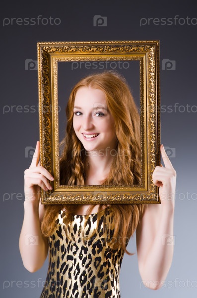 Рыжая женщина с картинной рамой на темном фоне