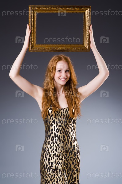 Рыжая женщина с картинной рамой на темном фоне
