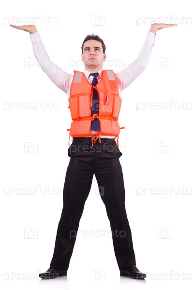 Мужчина в спасательном жилете, изолированный на белом