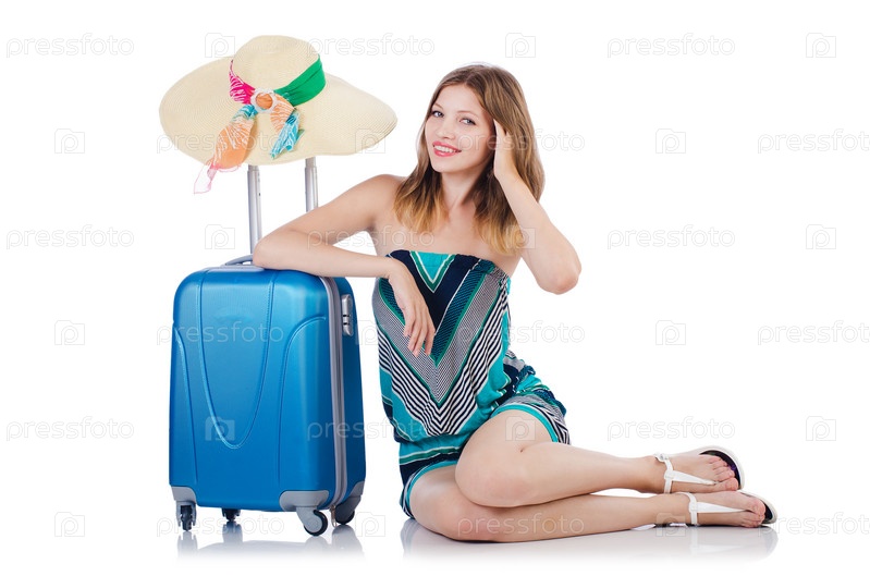 Женщина с чемоданом, изолированная на белом фоне