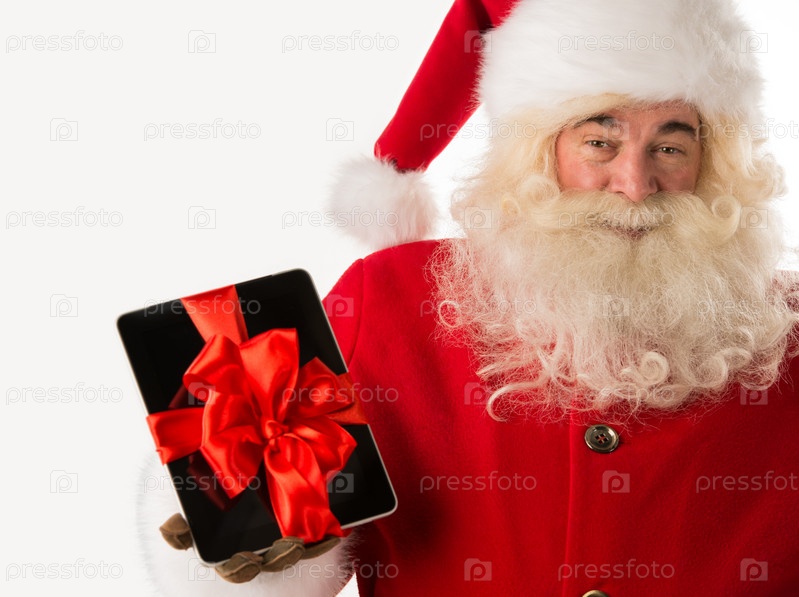 Дед Мороз держит планшетный компьютер с лентой в руках