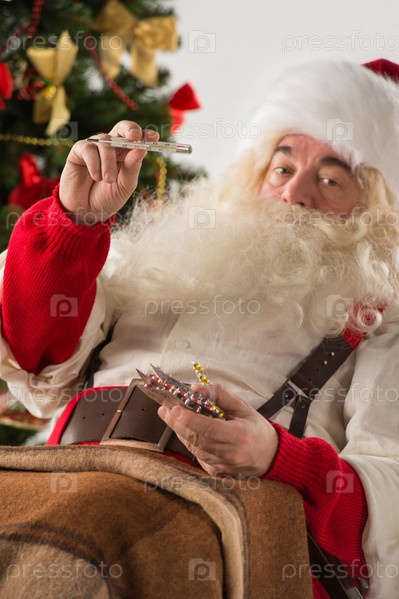 Удивленный Санта-Клаус измеряет температуру