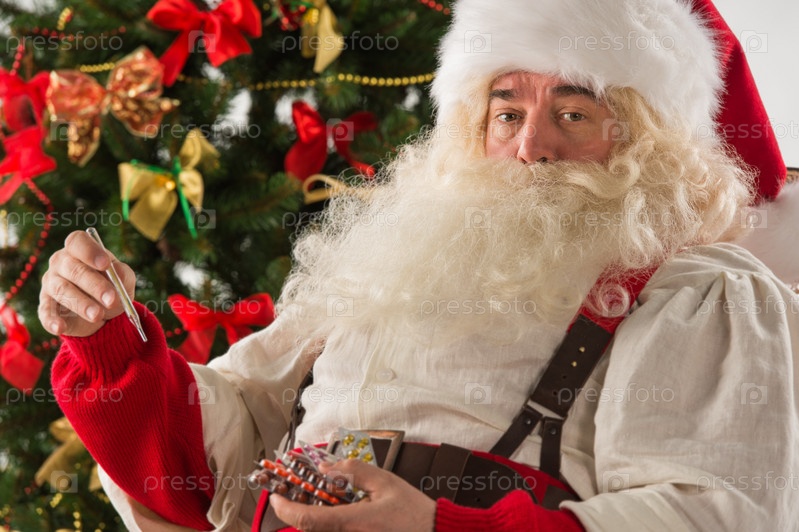 Удивленный Санта-Клаус измеряет температуру