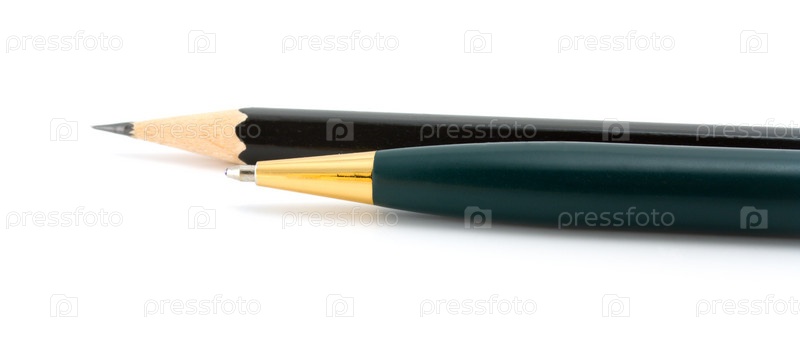 Офисные принадлежности - ручка и черный карандаш на белом фоне