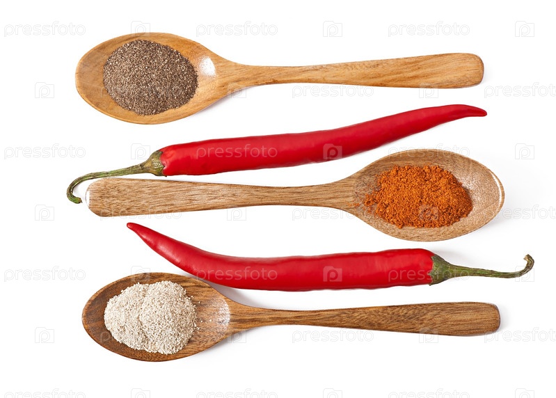 Различные острые приправы в деревянных ложках