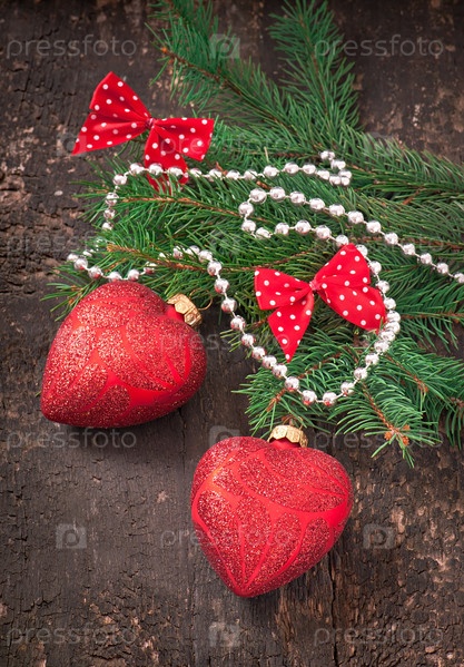 Елочные украшения и еловые ветки на старом деревянном фоне
