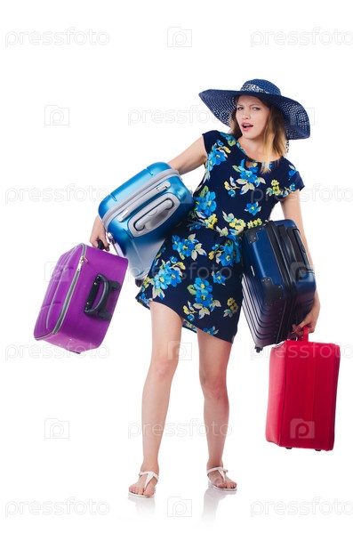 Женщина с чемоданами, изолированная на белом