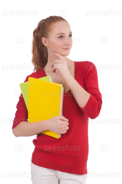 Молодая студентка с книгами на белом фоне