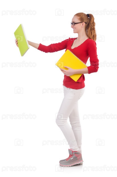 Молодая студентка с книгами на белом фоне
