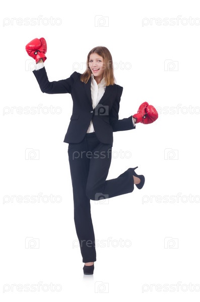 Деловая женщина в боксерских перчатках на белом фоне