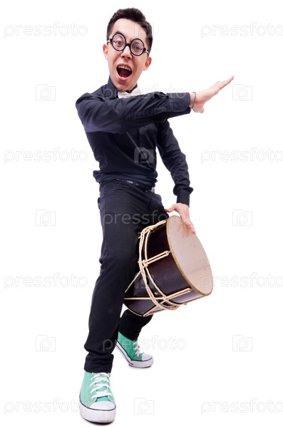 Забавный мужчина с барабаном на белом фоне