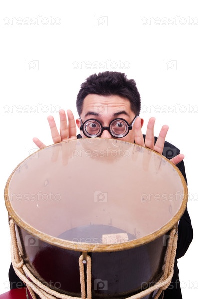 Забавный мужчина с барабаном на белом фоне
