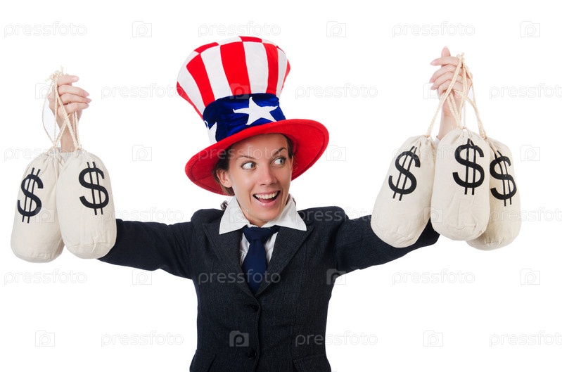 Деловая женщина с мешками денег на белом фоне