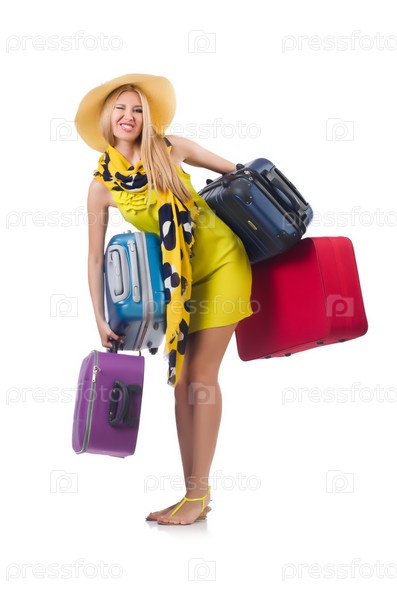Женщина с чемоданами, изолированная на белом