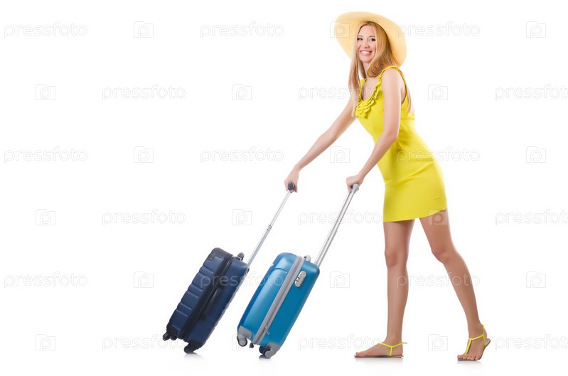 Женщина с чемоданами, изолированная на белом