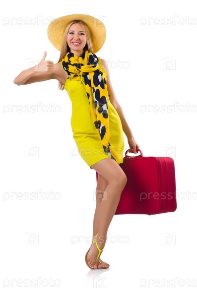 Женщина с чемоданами, изолированная на белом