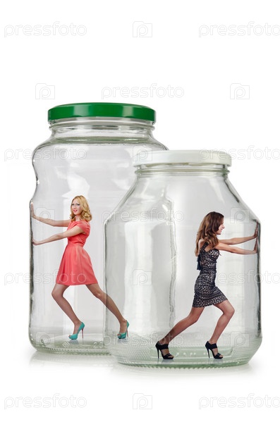 Женщина в стеклянной банке, изолированная на белом