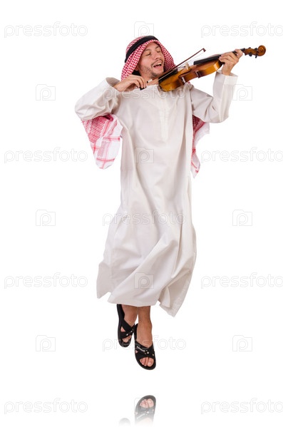 Араб играет на скрипке на белом фоне