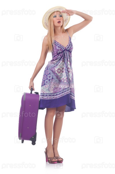 Женщина с чемоданами, изолированная на белом